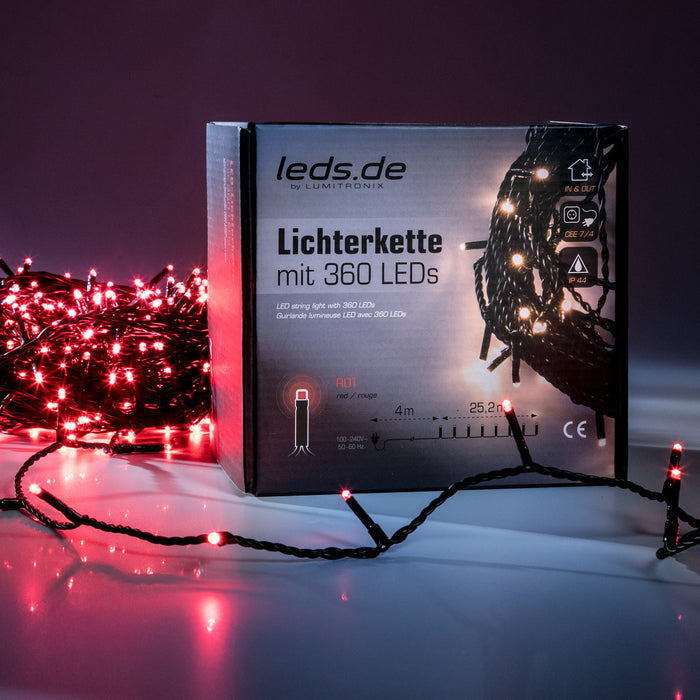 Unsere LED-Lichterkette ist eine brillante Lösung, um sowohl Innenräume als auch Außenbereiche mit 360 leuchtenden, roten LEDs zum Strahlen zu bringen. Hergestellt von leds.de, ist sie ein Qualitätsprodukt mit einem ausgezeichneten Preis-Leistungs-Verhältnis, das Beständigkeit und Effizienz vereint.